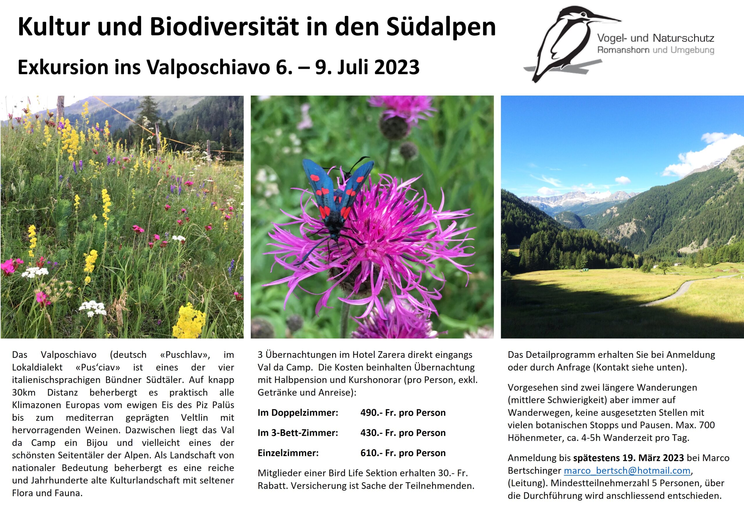 Der Vogel- und Naturschutzverein Romanshorn führt im Juli 2023 eine viertägige Exkursion in das Valposchiavo (Puschlav) durch, eines der italienischsprachigen Bündner Südtäler. Als Landschaft von nationaler Bedeutung beherbergt das Puschlav eine reiche und Jahrhunderte alte Kulturlandschaft mit seltener Flora und Fauna.